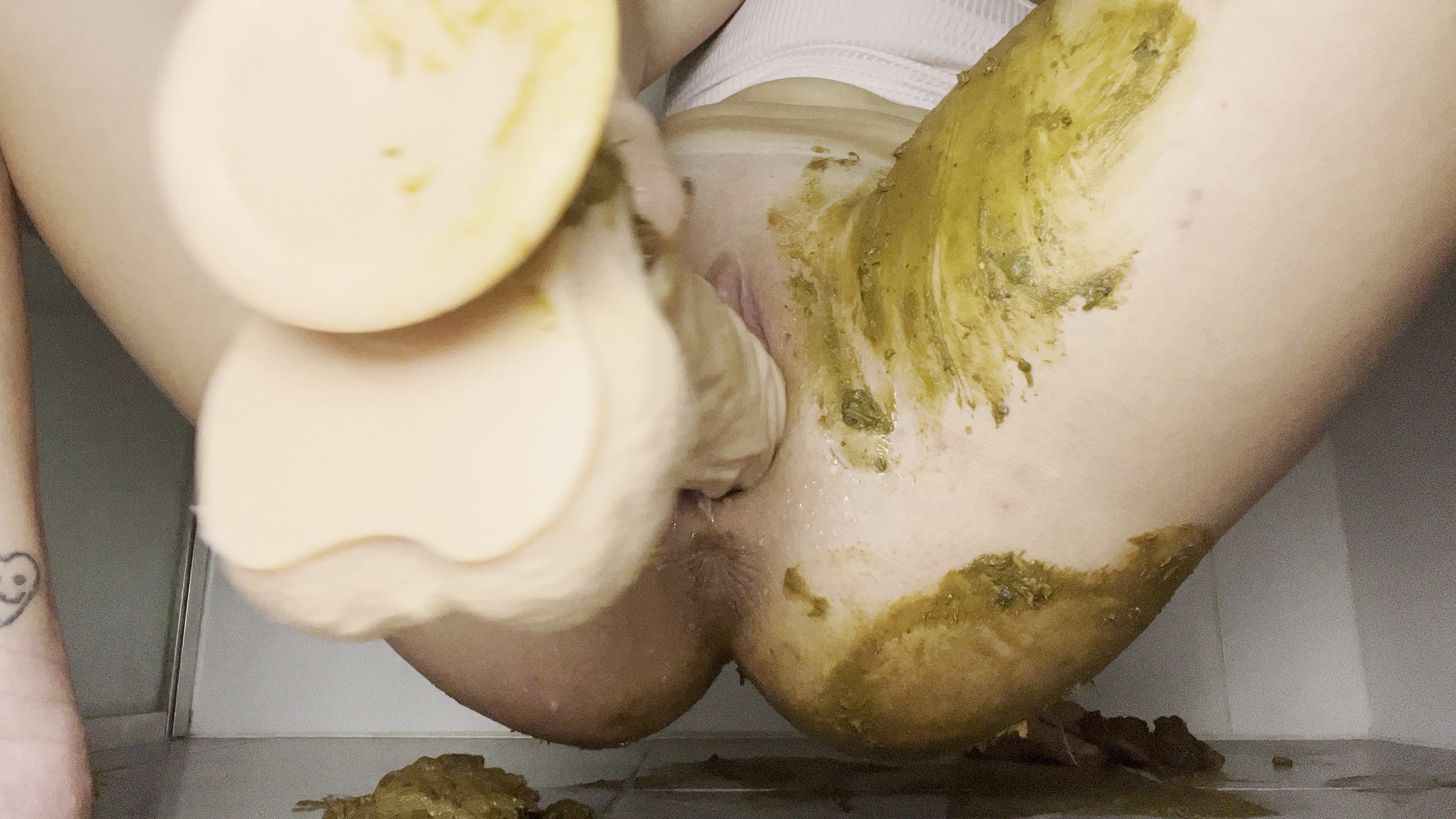 Riding a 10 inch dildo after a long day of work… I can’t help myself and shit while still riding it. I make the most out of it and I smear it on my ass. I turn around to face you and pee while I continue fucking my creamy wet pussy until I orgasm.