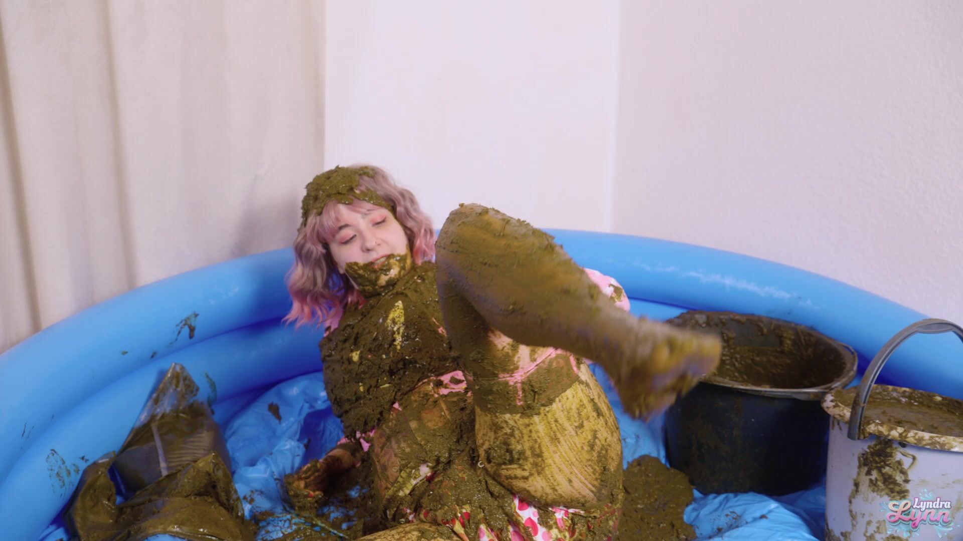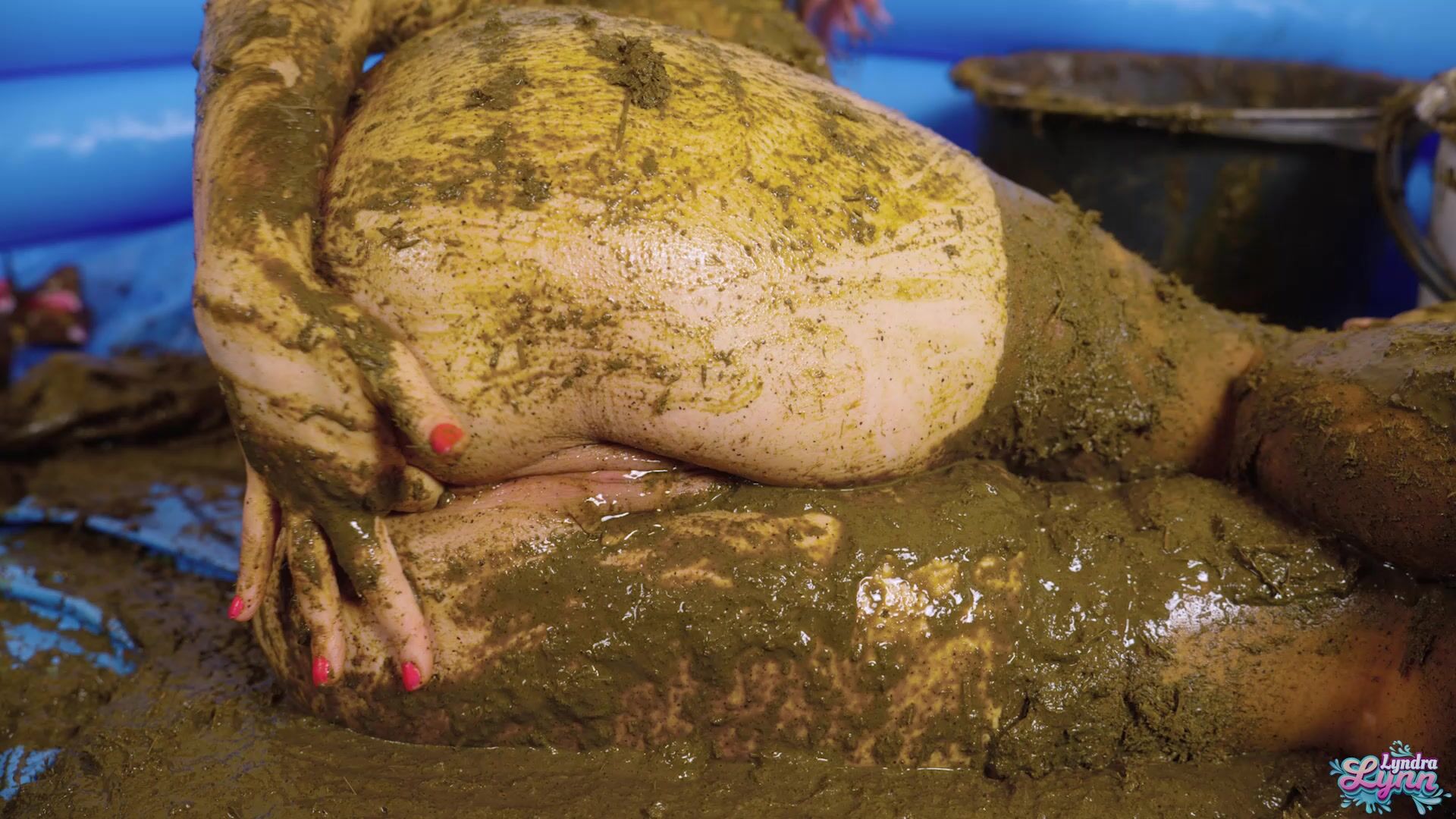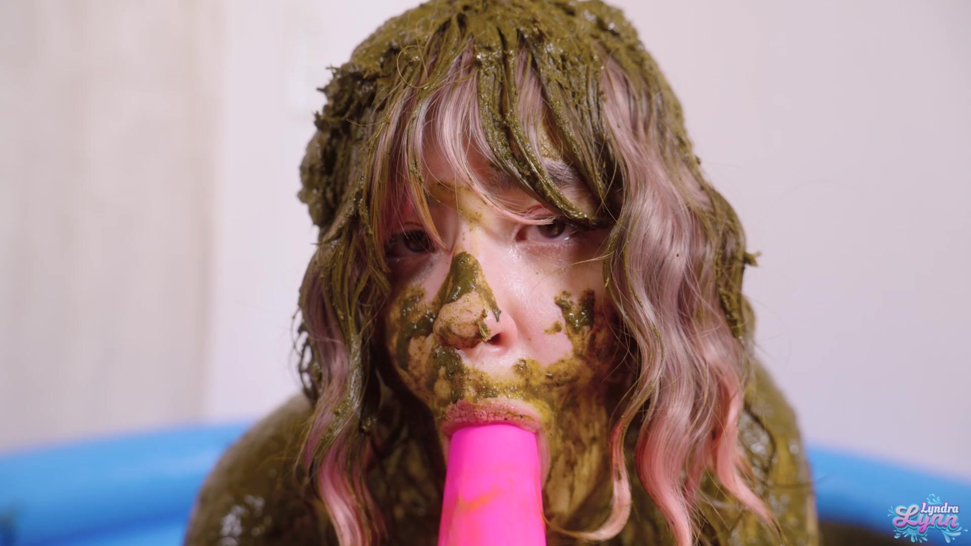 Hey it's Lyndra Lynn your messy waifu. I'm walking in with a bag full of cow dung and start right away to put some on my sweater. I begin to cover myself bit by bit, while showing you my hot body. I begin to sit on a cow dung bag and ride it, so it slides nicely over my clit. Then I start to finger my hot and wet pussy while laying in all that filth. I get out my popsicle dildo and begin to fuck my pussy with. I ride it while playing with my tits and cover them even more in cow dung. Of course my asshole want some too so I begin to finger it and then push the black dildo in it. It made me extremely horny, I wanted to fill both of my holes, which I did. I had an amazing orgasm. Then I filled the bucket completely with cow dung and put the dildo in it, so I can ride it while the cow dung slaps against my pussy. After that I'm going in for another orgasm while laying on my back. After that I play some more with the nice creamy stinky cow dung.