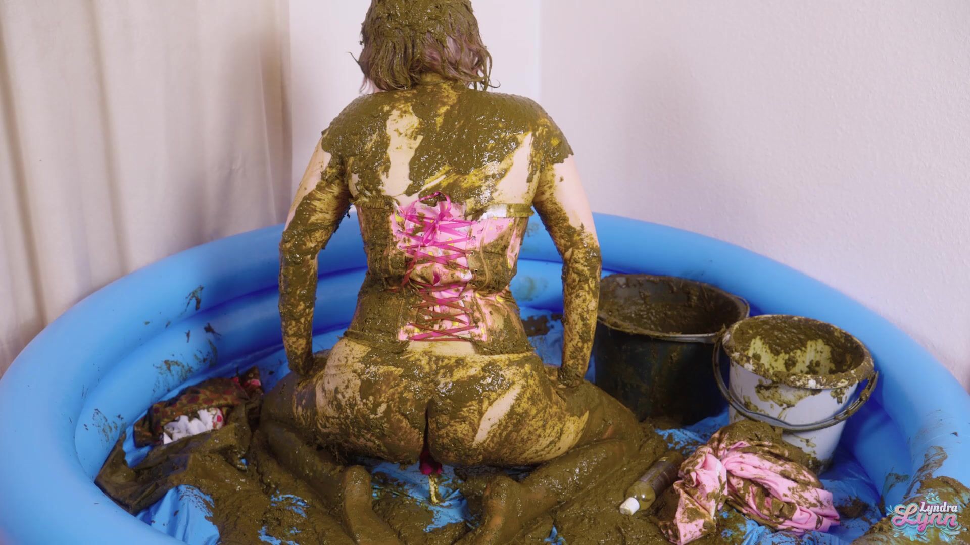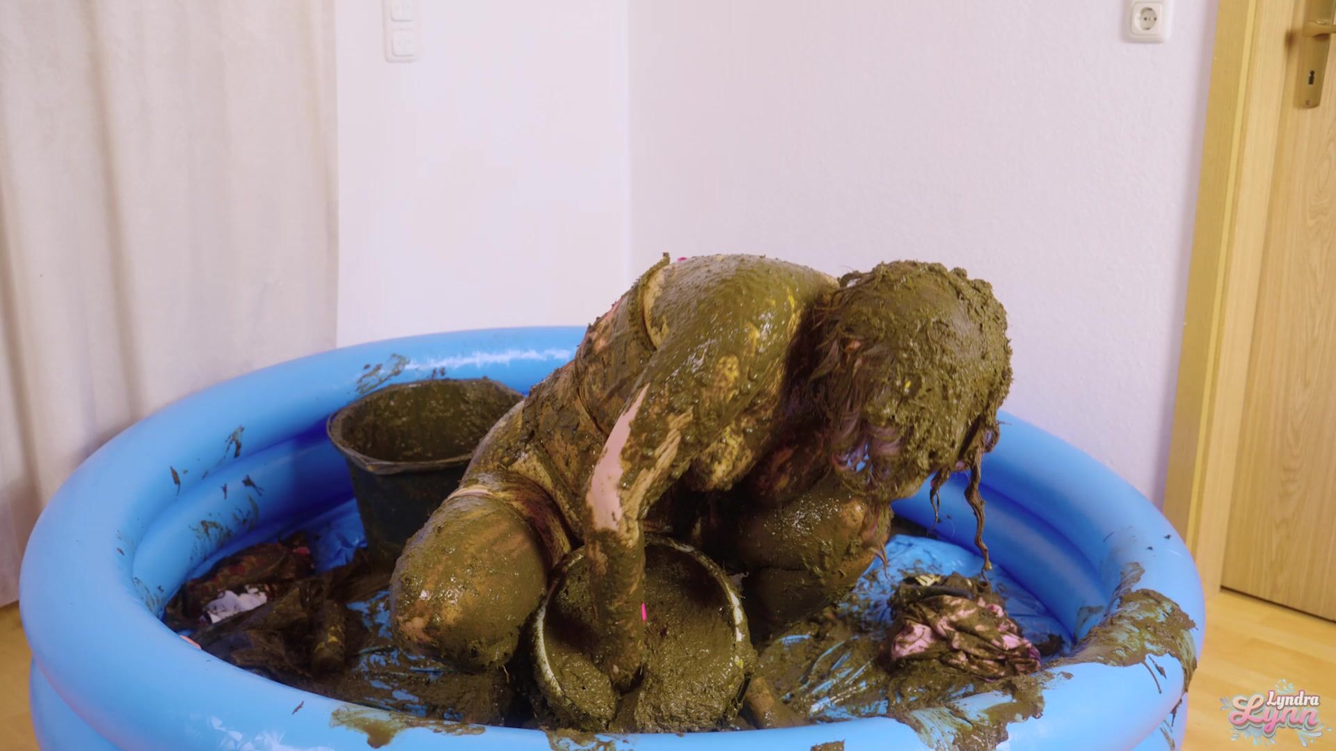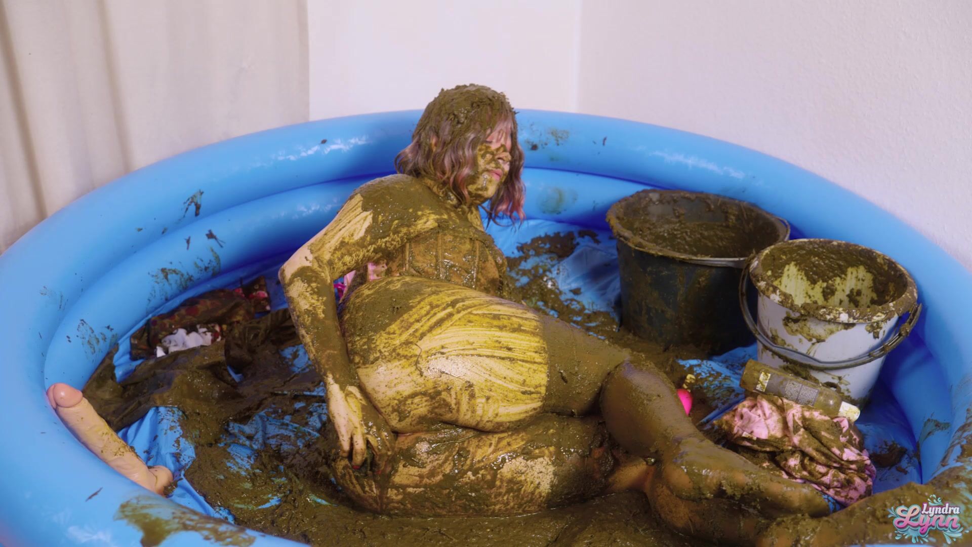 Hey it's Lyndra Lynn your messy waifu. I'm walking in with a bag full of cow dung and start right away to put some on my sweater. I begin to cover myself bit by bit, while showing you my hot body. I begin to sit on a cow dung bag and ride it, so it slides nicely over my clit. Then I start to finger my hot and wet pussy while laying in all that filth. I get out my popsicle dildo and begin to fuck my pussy with. I ride it while playing with my tits and cover them even more in cow dung. Of course my asshole want some too so I begin to finger it and then push the black dildo in it. It made me extremely horny, I wanted to fill both of my holes, which I did. I had an amazing orgasm. Then I filled the bucket completely with cow dung and put the dildo in it, so I can ride it while the cow dung slaps against my pussy. After that I'm going in for another orgasm while laying on my back. After that I play some more with the nice creamy stinky cow dung.